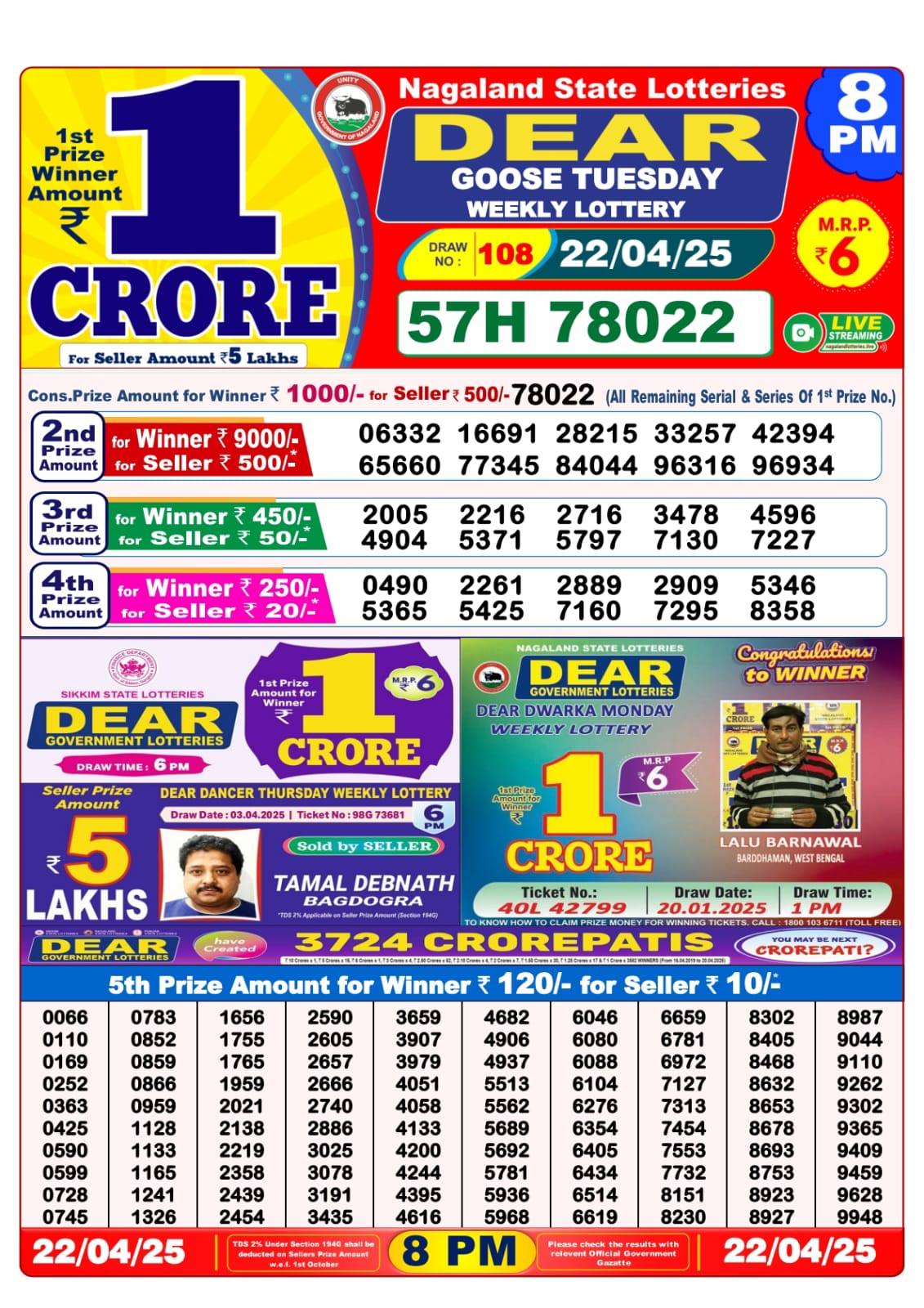 Dear goose tuesday weekly lottery 8 pm result 22-4-25