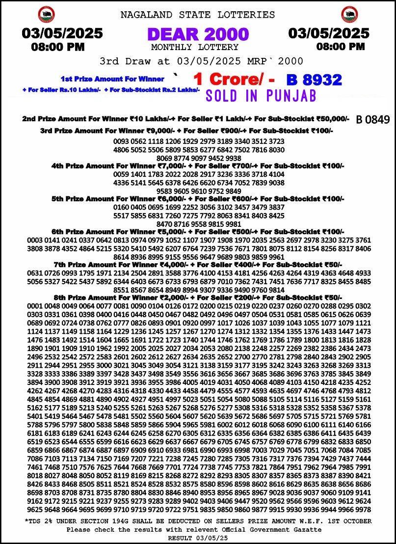 Dear 2000 monthly lottery result 8pm 3-5-25