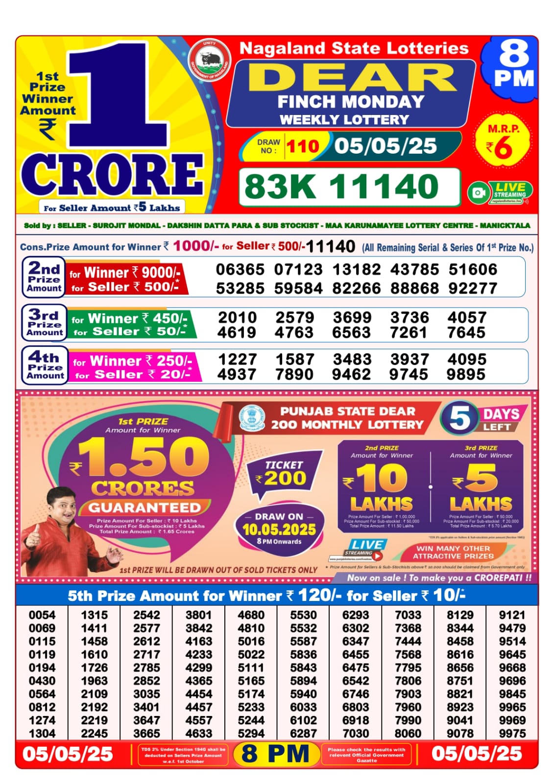 Dear finch monday weekly lottery 8 pm result 5-5-25