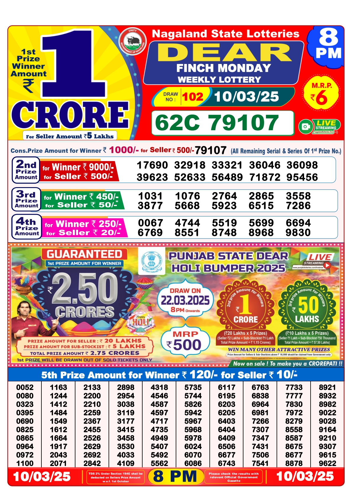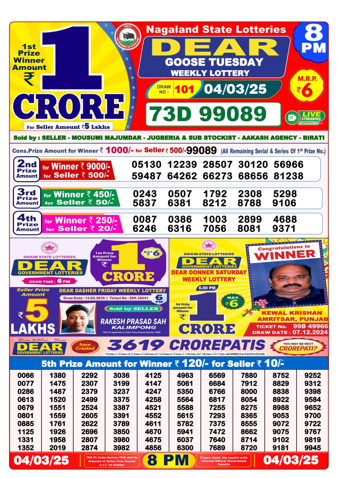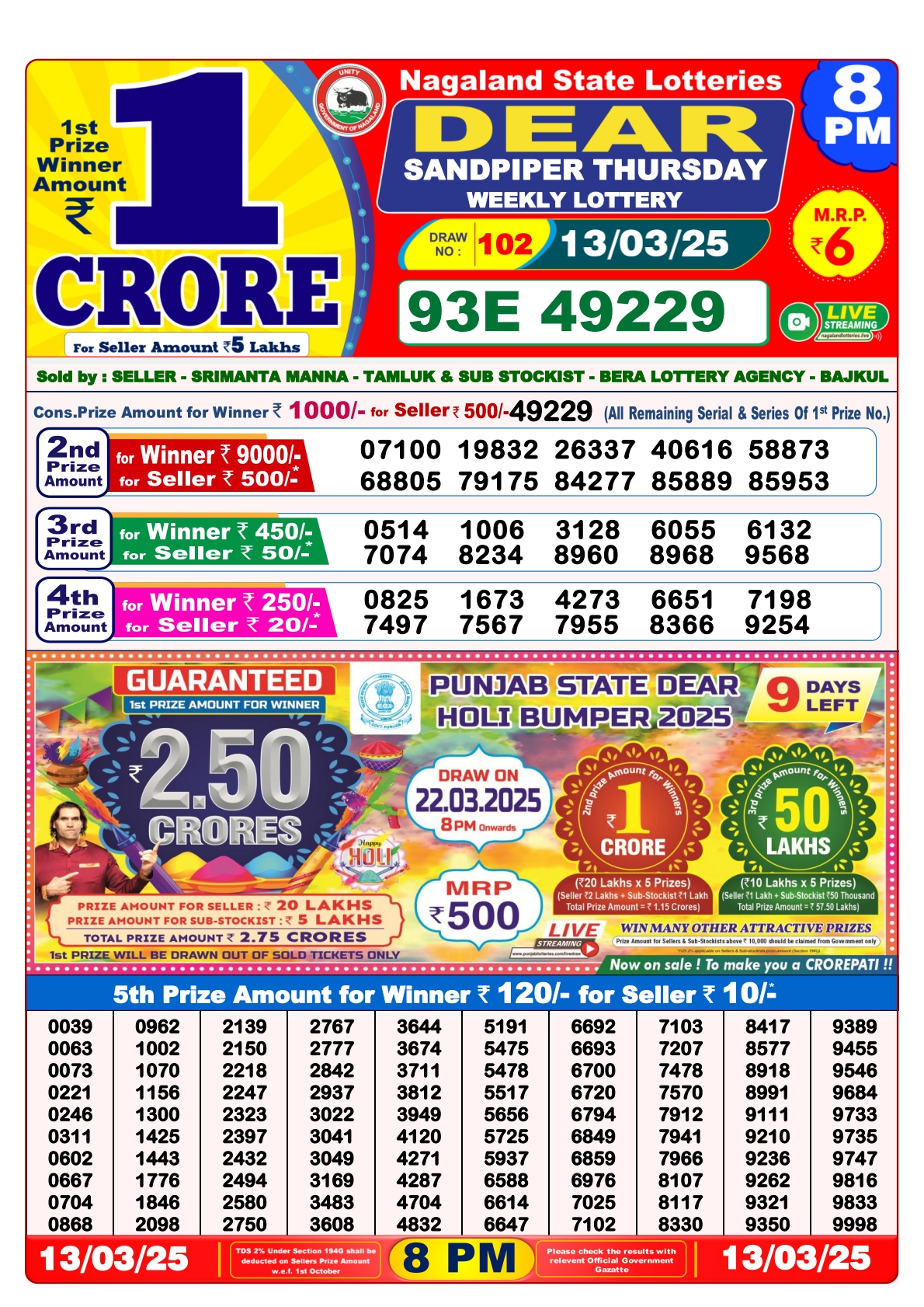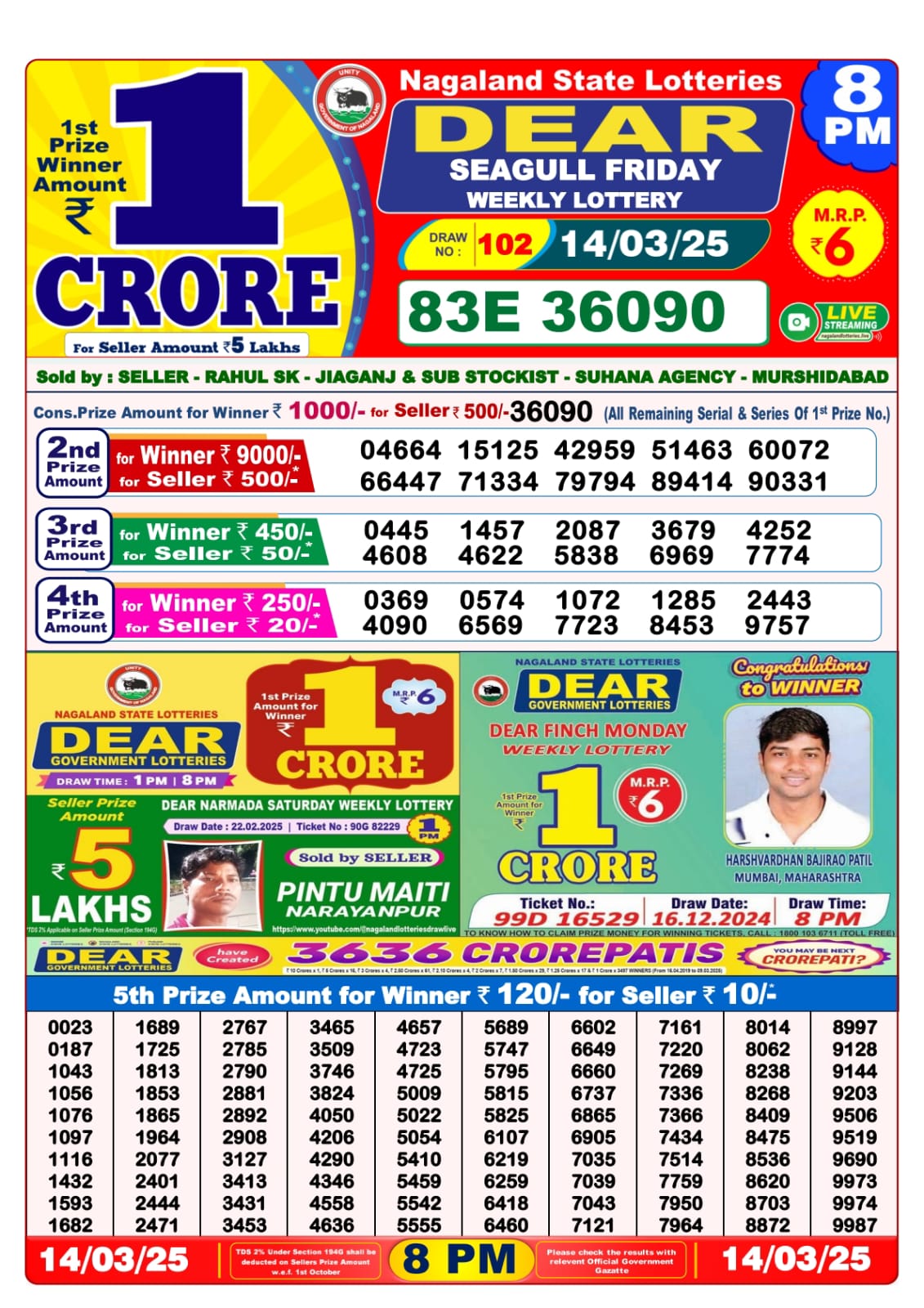 Dear seagull friday weekly lottery 8 pm result 14-3-25