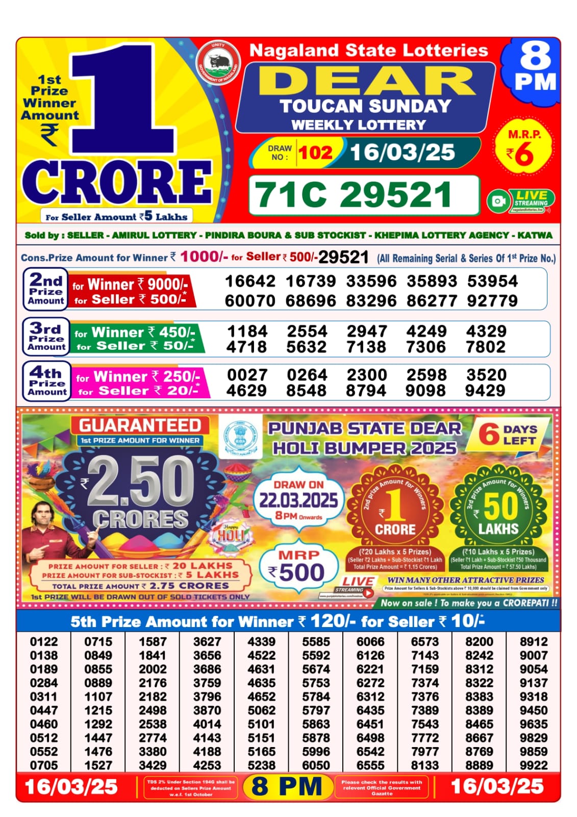 Dear toucan sunday weekly lottery 8 pm result 16-3-25
