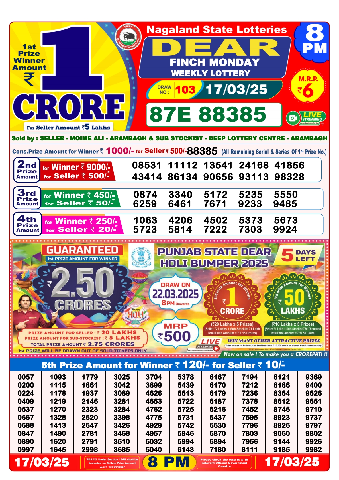 Dear finch monday weekly lottery 8 pm result 17-3-25