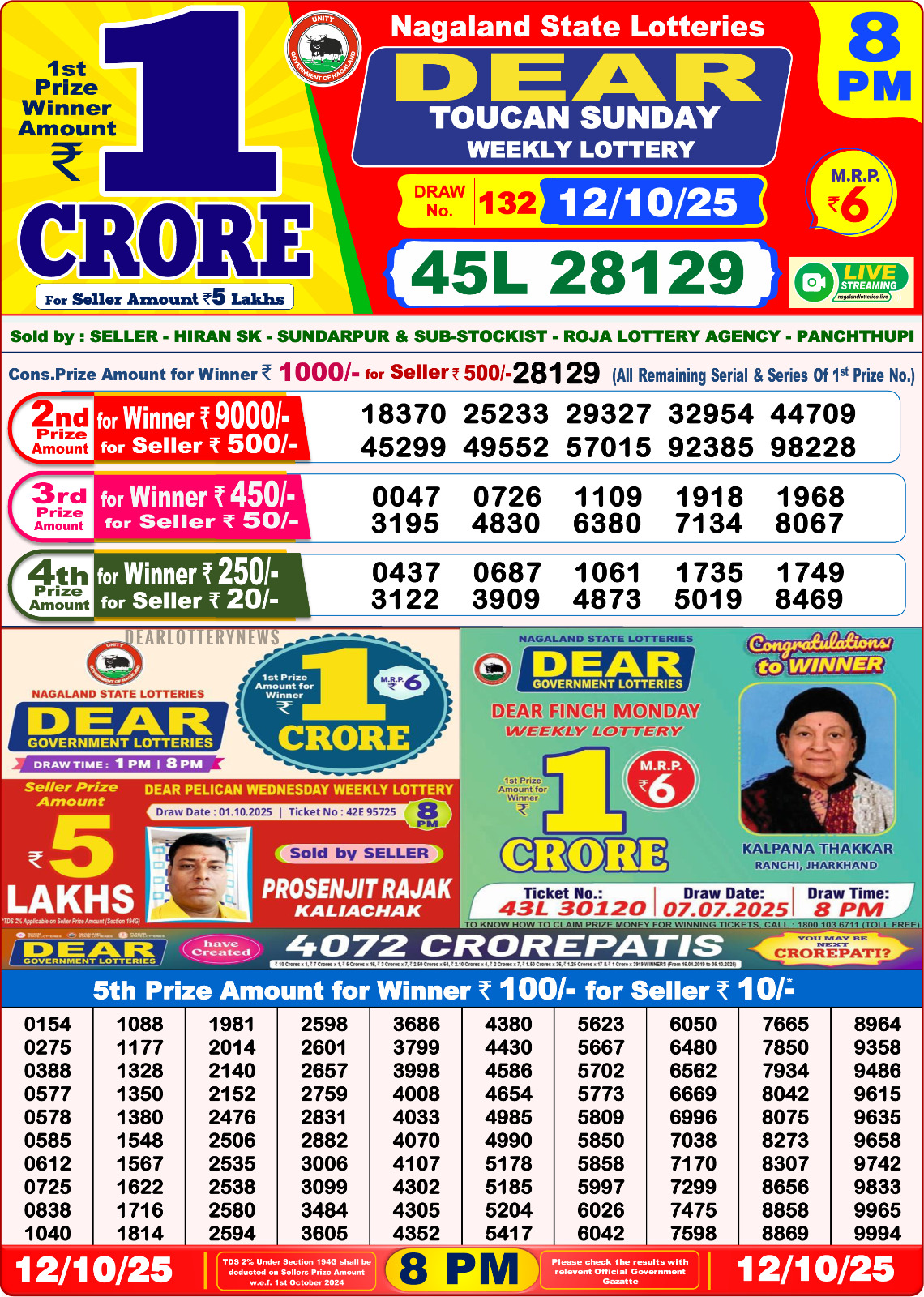 Dear Toucan Sunday Weekly Lottery 8 PM Result 12-10-25