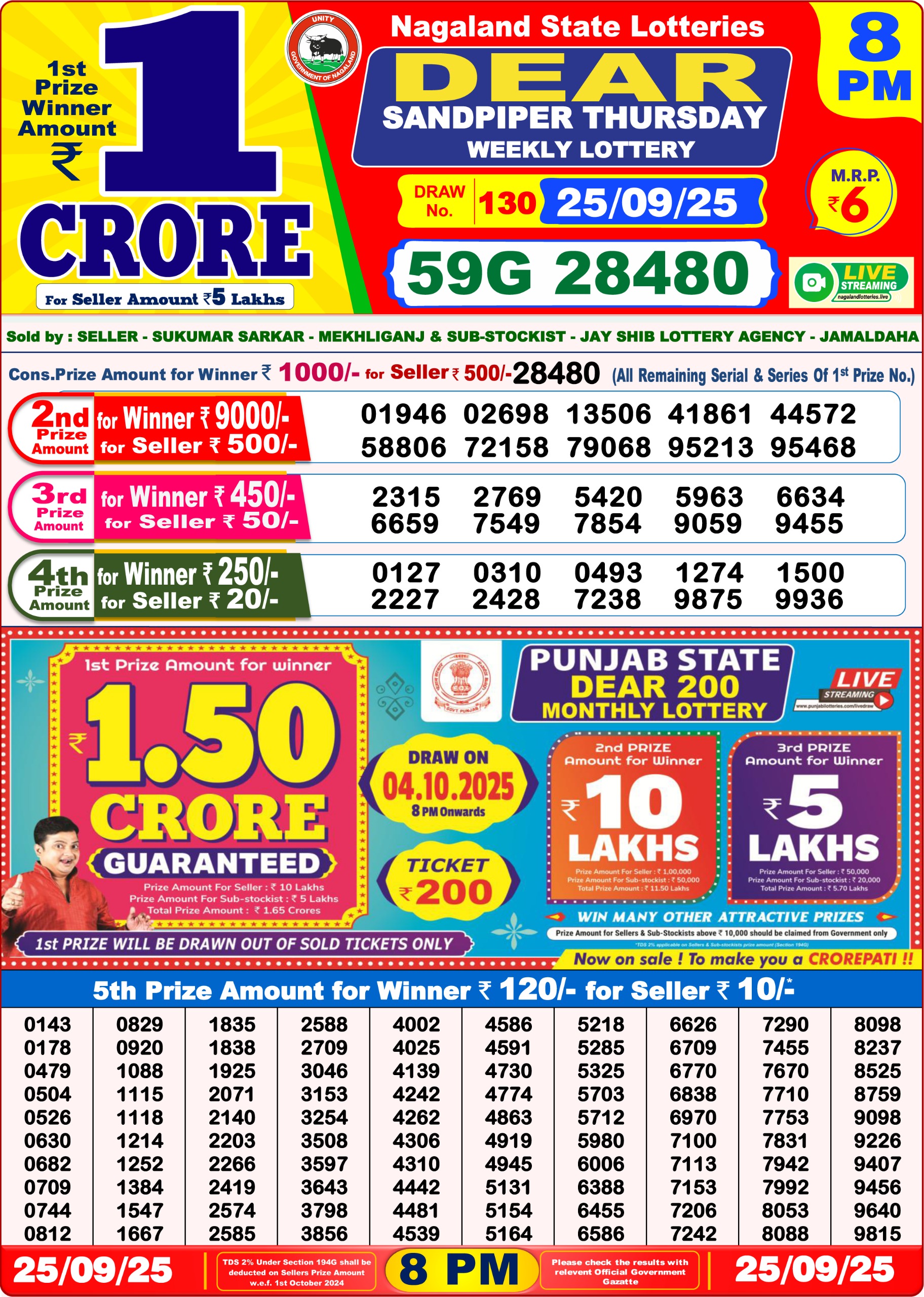 Dear Sandpiper Thursday Weekly Lottery 8 PM Result 25-09-25