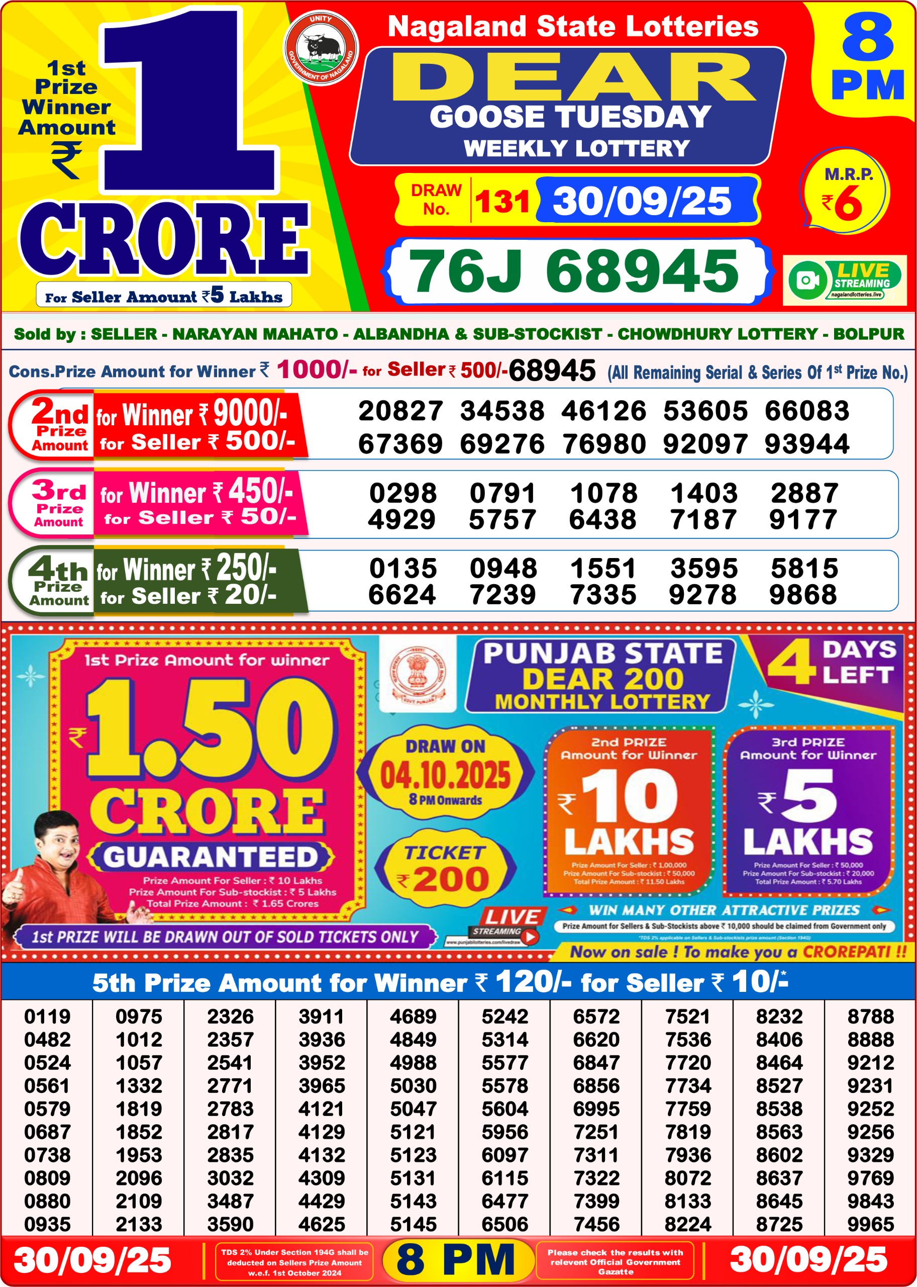 Dear Seagull Friday Weekly Lottery 8 PM Result 26-09-25