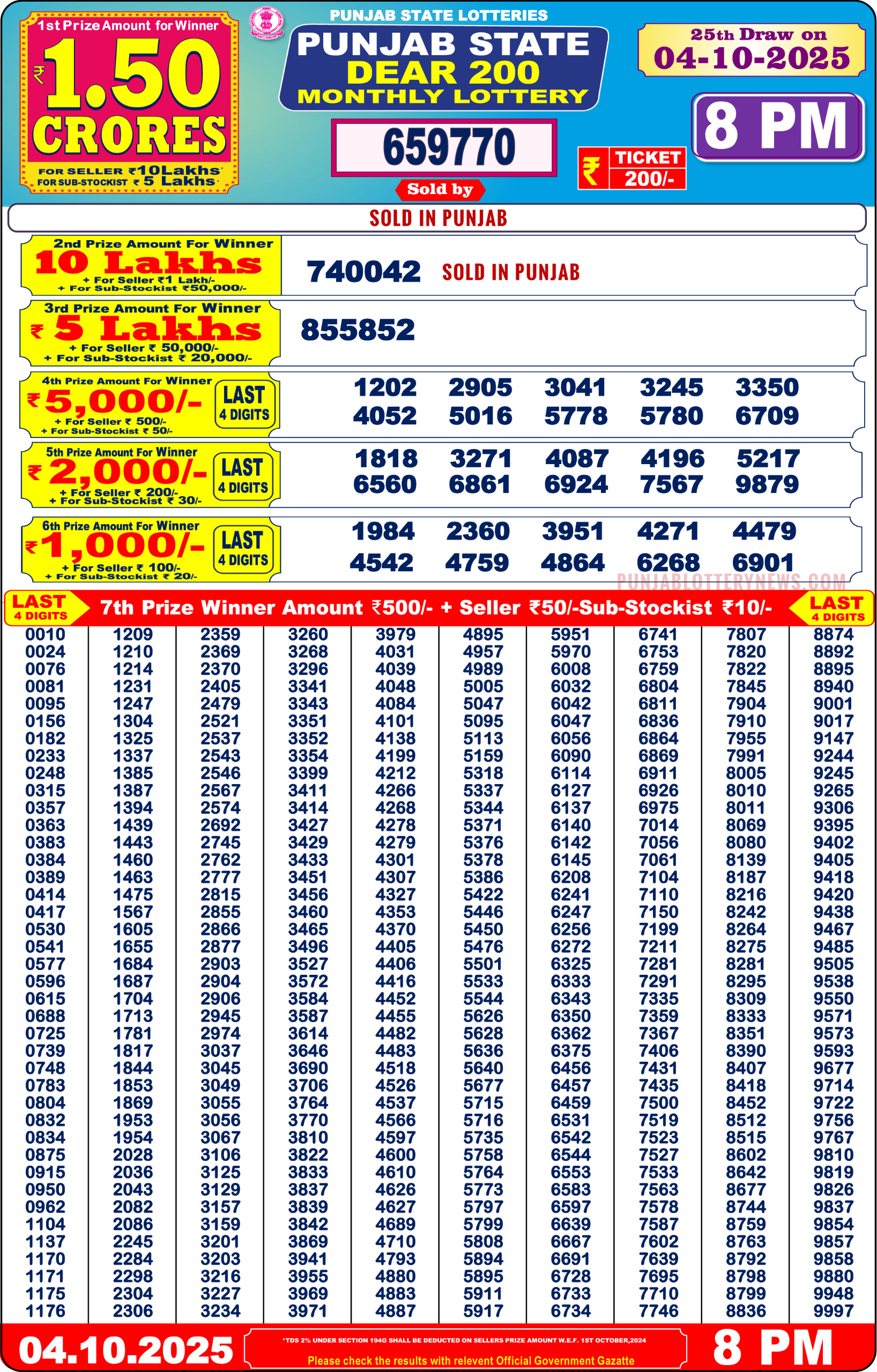 Punjab State Dear 200 Monthly Lottery Result 04-10-25 Declared