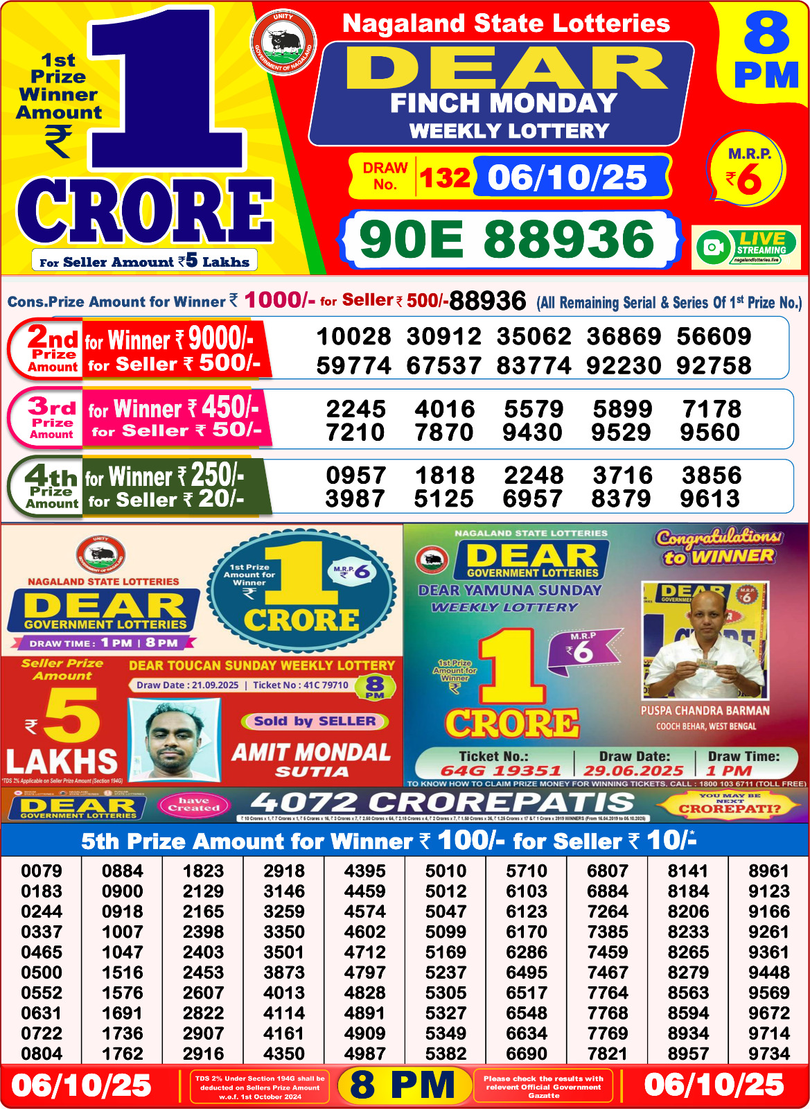 Dear Finch Monday Weekly Lottery 8 PM Result 06-10-25