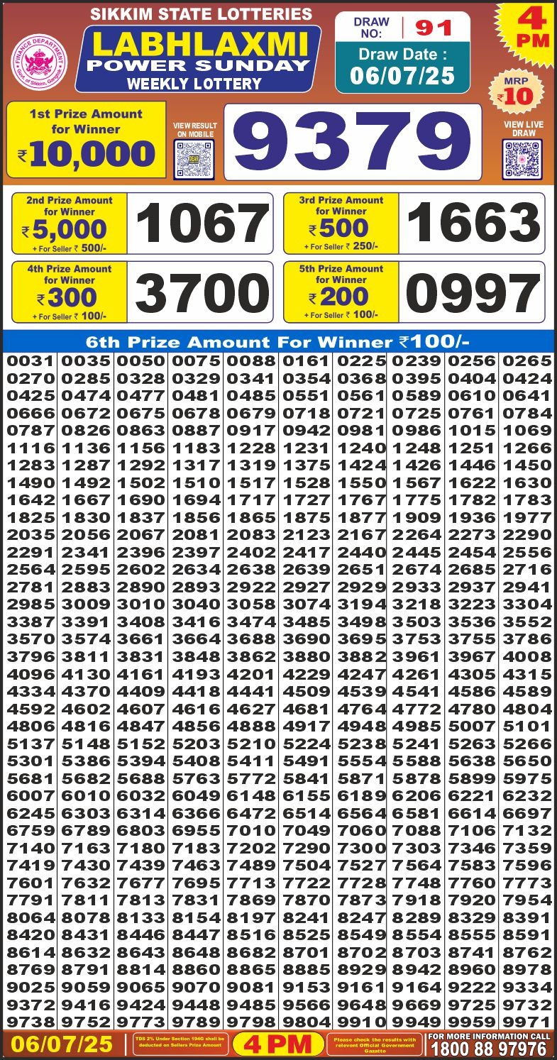 Labhlaxmi power sunday weekly lottery 4 pm result 6-7-25