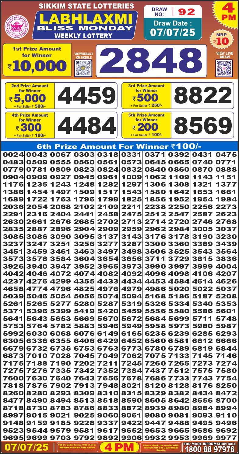Labh Laxmi charm tuesday weekly lottery 4 pm result 1-7-25