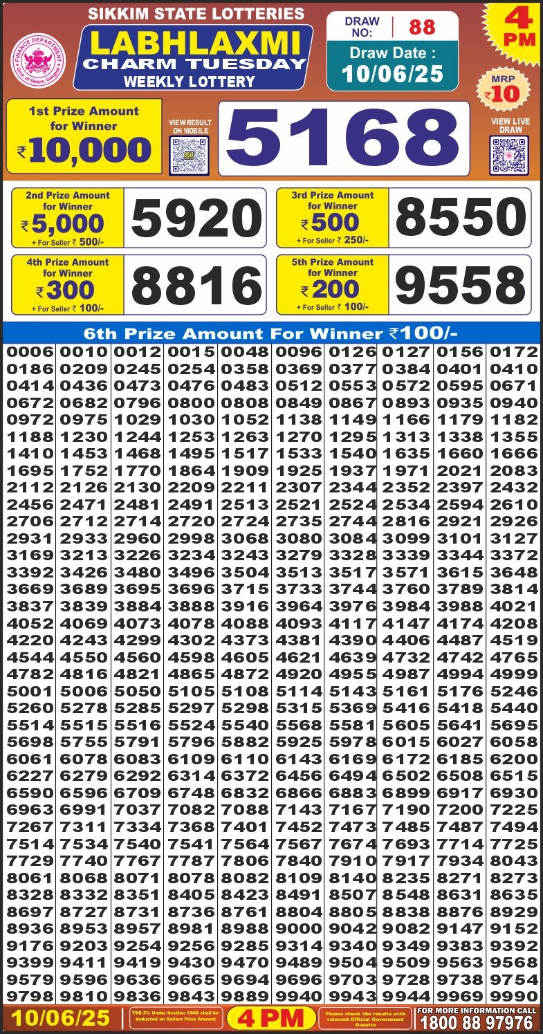 Labh Laxmi charm tuesday weekly lottery 4 pm result 10-6-25