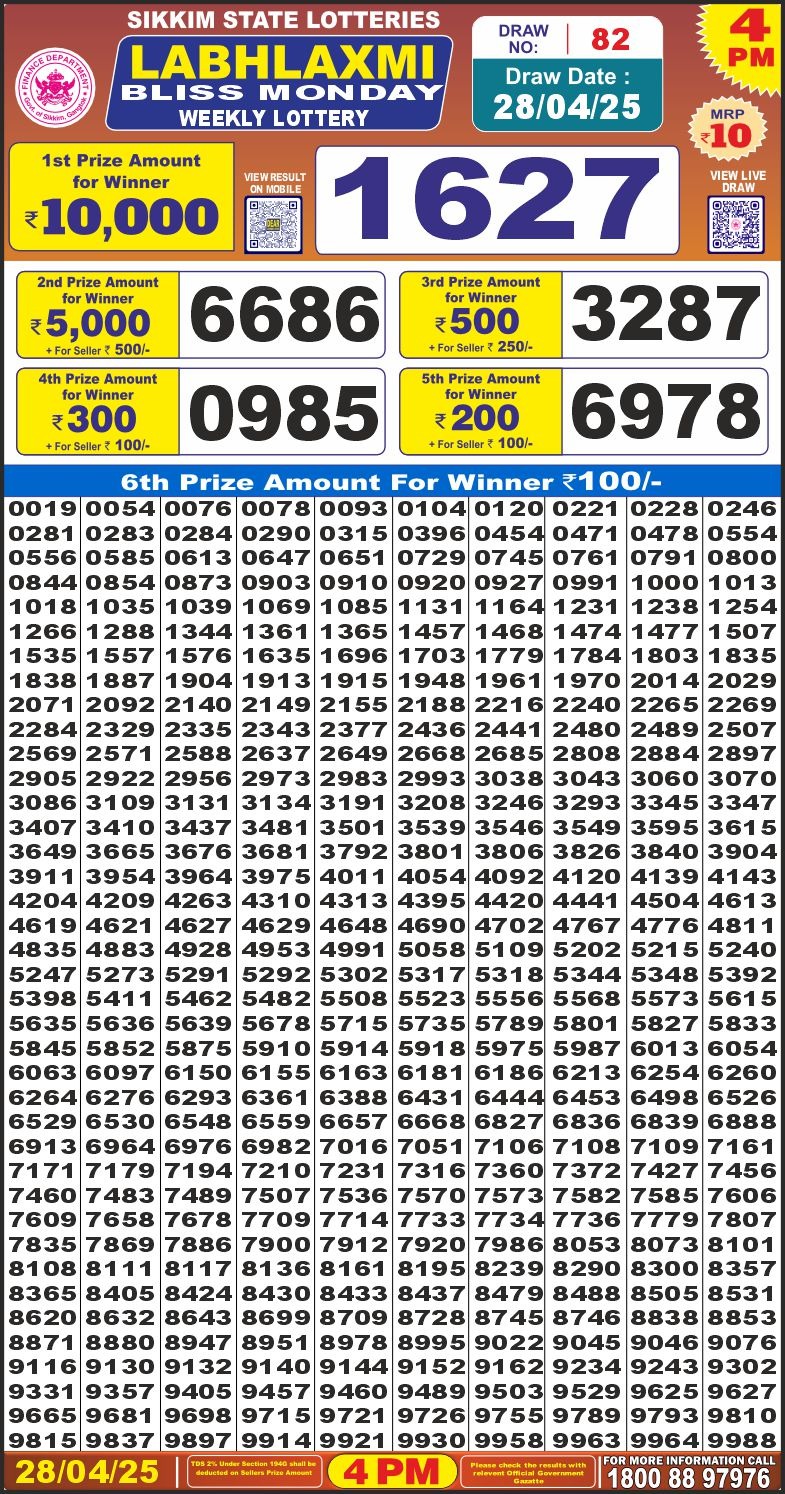 Labh Laxmi bliss monday weekly lottery 4 pm result 28-4-25