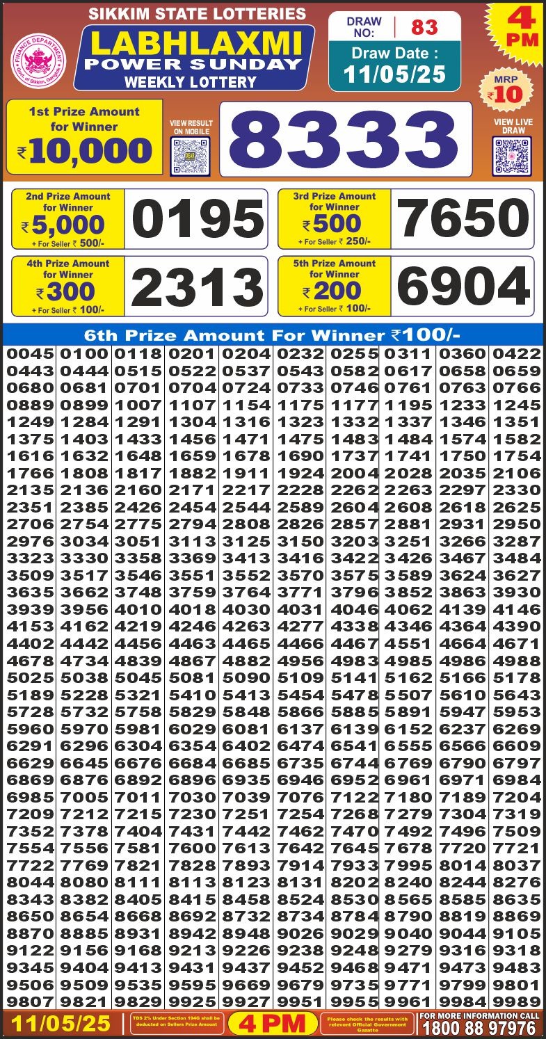 Labhlaxmi power sunday weekly lottery 4 pm result 11-5-25