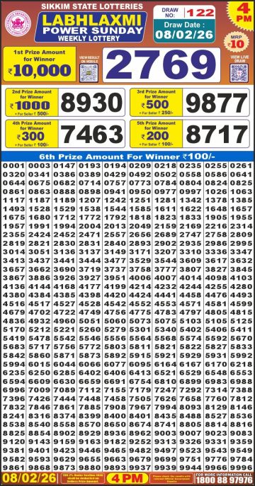Labh Laxmi Power Sunday Weekly Lottery 4pm Result 08-02-26