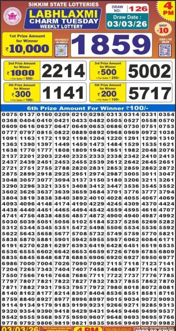 Labh Laxmi Charm Tuesday Weekly Lottery 4pm Result 03-03-26