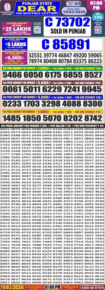 Punjab State Dear 100 Monthly Lottery 7pm Result 10-03-26