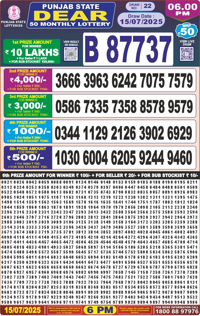 Punjab state dear 50 monthly lottery 6pm result 15-7-25