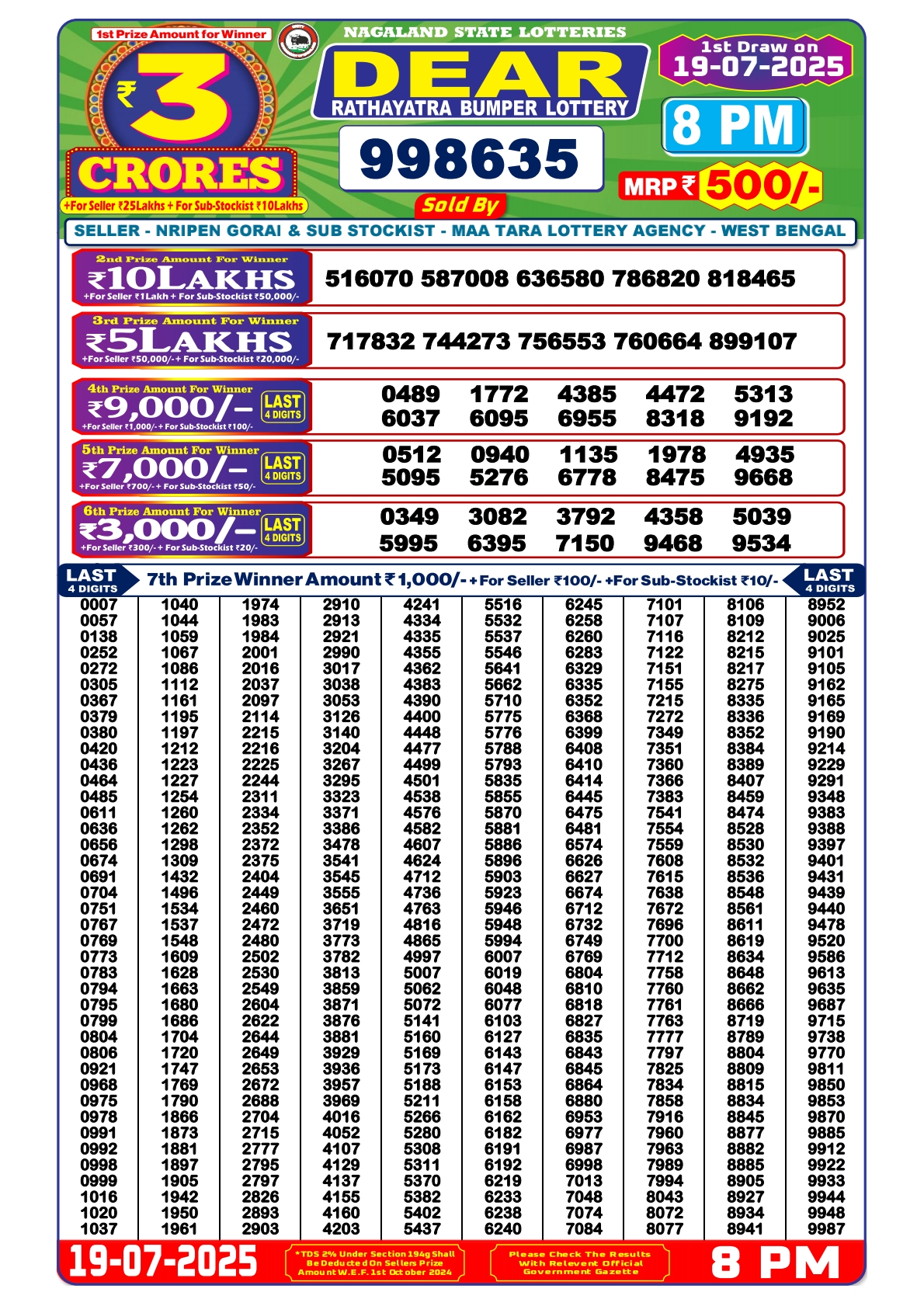 Dear Rathayatra bumper lottery result 19.07.25 prize list