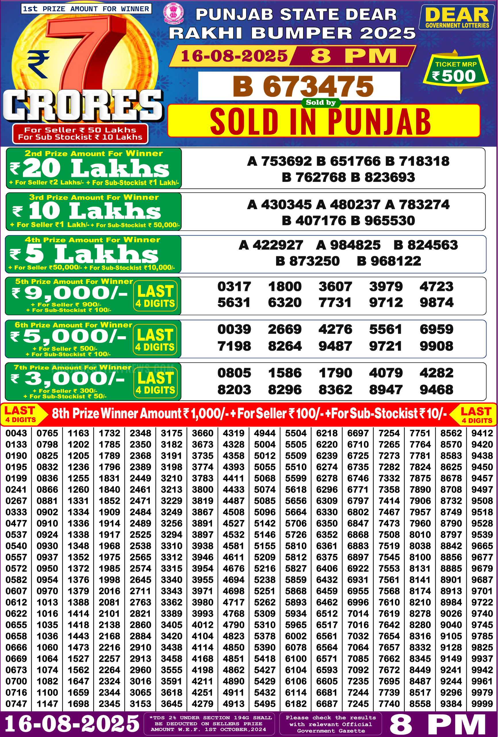 Punjab state dear Rakhi bumper lottery result 16.08.25 declared
