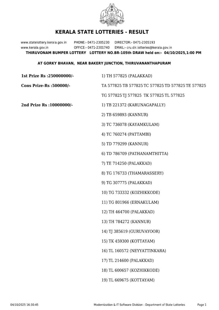 Kerala Bumper BR-105 Lottery Result 04-10-25 Declared