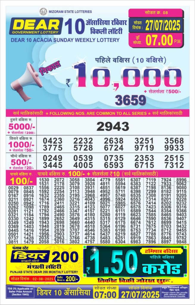 Dear 10 Acacia Sunday Weekly Lottery 7 PM Result 27-07-25 wpailnadmin July 27, 2025 Leave a Comment on Dear 10 Acacia Sunday Weekly Lottery 7 PM Result 27-07-25 Posted in Dear 10 Lottery 7 PM Result Share: XFacebookPinterestRedditVKDiggLinkedinMix Related Results Dear 10 Acacia Sunday Weekly Lottery 7 PM Result 21-09-25 Dear 10 Cypress Saturday Weekly Lottery 7 PM Result 20-09-25 Dear 10 Conifer Friday Weekly Lottery 7 PM Result 19-09-25 Dear 10 Oak Thursday Weekly Lottery 7 PM Result 18-09-25 Dear 10 Cedar Wednesday Weekly Lottery 7 PM Result 17-09-25 Dear 10 Pine Tuesday Weekly Lottery 7 PM Result 16-09-25 Dear 10 Maple Monday Weekly Lottery 7 PM Result 15-09-25 Author: wpailnadmin Website