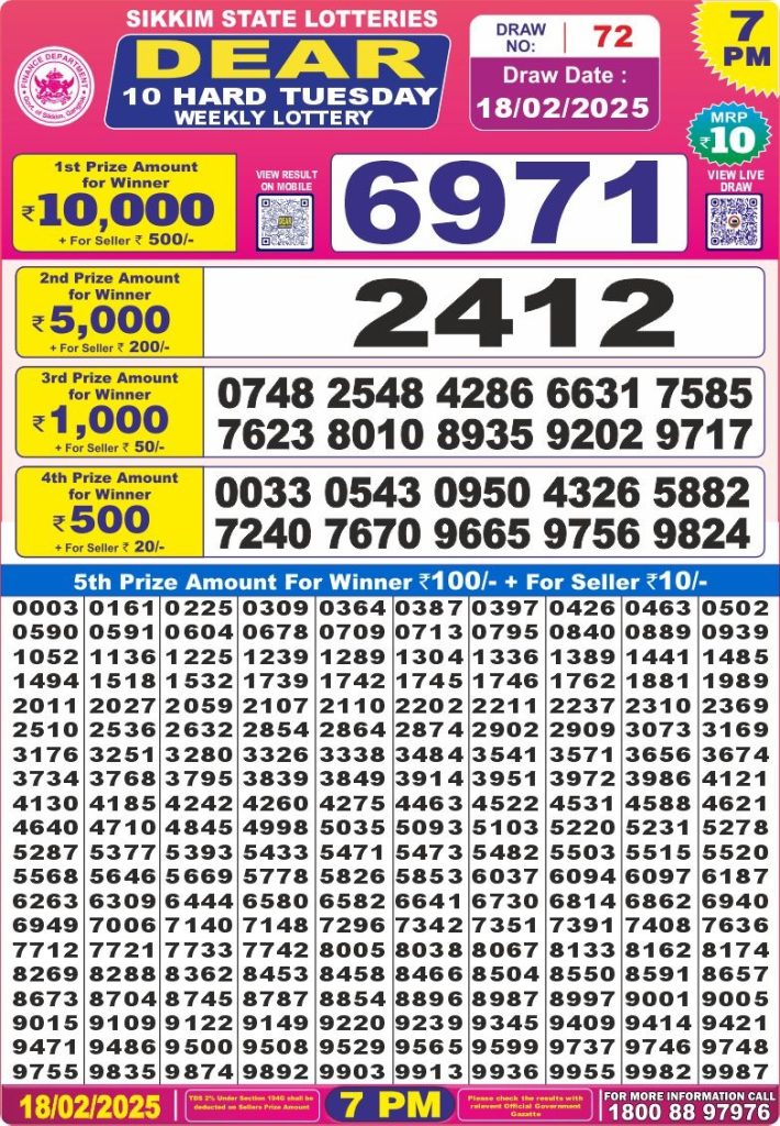 Dear 10 hard tuesday weekly lottery 7 pm result 18-2-25