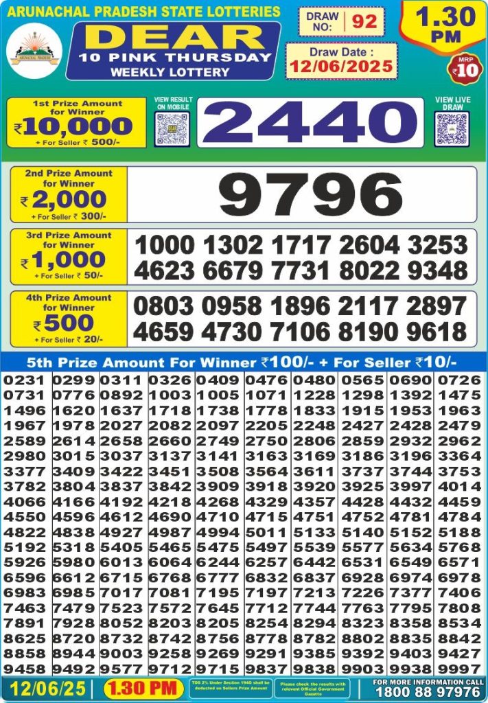 Dear 10 pink Thursday weekly lottery 1:30 pm result 12-6-25