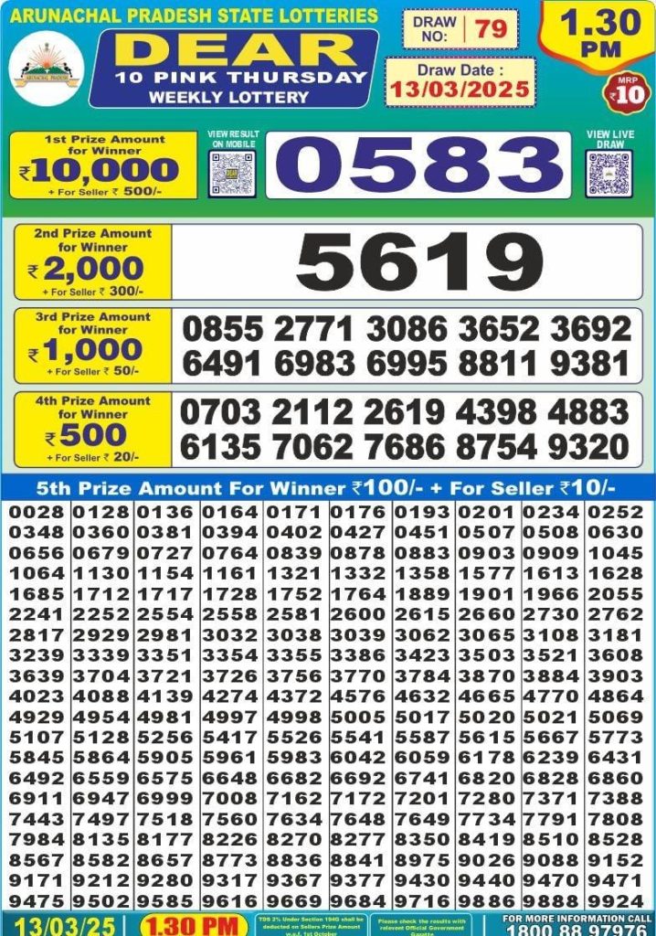 Dear 10 pink Thursday weekly lottery 1:30 pm result 13-3-25