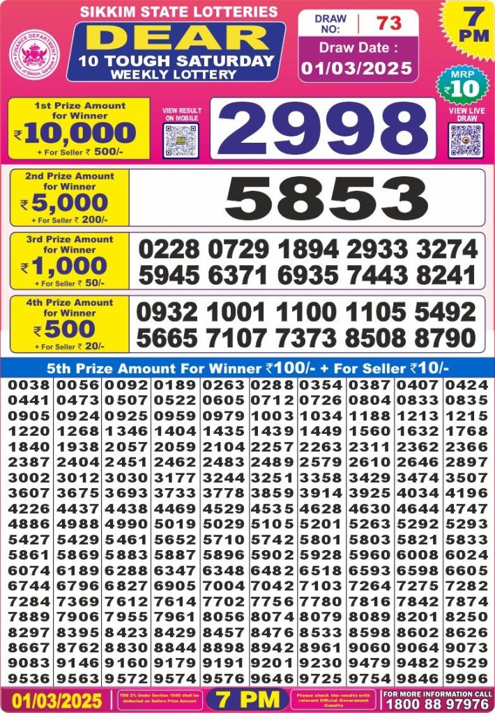 Dear 10 tough saturday weekly lottery 7 pm result 1-3-25