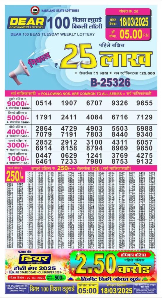 Dear 100 beas tuesday weekly lottery 5 pm result 18-3-25