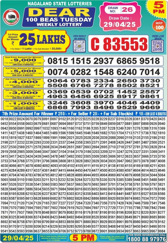Dear 100 beas tuesday weekly lottery 5 pm result 29-4-25 Results Editorial Staff April 29, 2025 Leave a Comment on Dear 100 beas tuesday weekly lottery 5 pm result 29-4-25 Posted in Dear 100 Lottery 5 PM Result Share: XFacebookPinterestRedditVKDiggLinkedinMix Related Results Dear 100 gomti Saturday weekly lottery 5 pm result 26-7-25 Dear 100 ganga Thursday weekly lottery 5 pm result 24-7-25 Dear 100 beas tuesday weekly lottery 5 pm result 22-7-25 Dear 100 gomti Saturday weekly lottery 5 pm result 19-7-25 Dear 100 ganga Thursday weekly lottery 5 pm result 17-7-25 Dear 100 beas tuesday weekly lottery 5 pm result 15-7-25 Dear 100 gomti Saturday weekly lottery 5 pm result 12-7-25 Author: Results Editorial Staff
