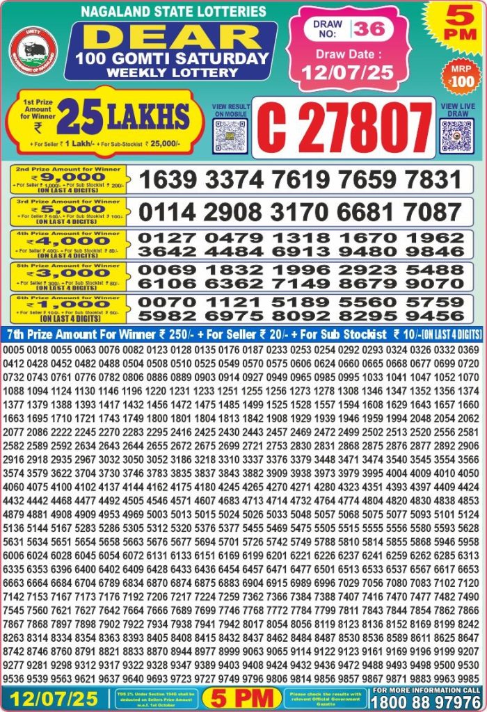 Dear 100 gomti Saturday weekly lottery 5 pm result 12-7-25 Results Editorial Staff July 12, 2025 Leave a Comment on Dear 100 gomti Saturday weekly lottery 5 pm result 12-7-25 Posted in Dear 100 Lottery 5 PM Result Share: XFacebookPinterestRedditVKDiggLinkedinMix Related Results Dear 100 gomti Saturday weekly lottery 5 pm result 26-7-25 Dear 100 ganga Thursday weekly lottery 5 pm result 24-7-25 Dear 100 beas tuesday weekly lottery 5 pm result 22-7-25 Dear 100 gomti Saturday weekly lottery 5 pm result 19-7-25 Dear 100 ganga Thursday weekly lottery 5 pm result 17-7-25 Dear 100 beas tuesday weekly lottery 5 pm result 15-7-25 Dear 100 ganga Thursday weekly lottery 5 pm result 10-7-25 Author: Results Editorial Staff