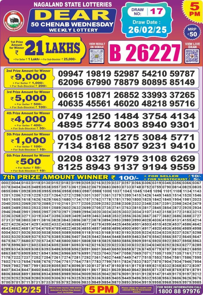 Dear 50 chenab Wednesday weekly lottery 5 pm result 26-2-25 site editor February 26, 2025 Leave a Comment on Dear 50 chenab Wednesday weekly lottery 5 pm result 26-2-25 Posted in Dear 50 Lottery 5 PM Result Share: XFacebookPinterestRedditVKDiggLinkedinMix Related Results Dear 50 Ravi Sunday Weekly Lottery 5 PM Result 27-07-25 Dear 50 sutluj friday weekly lottery 5 pm result 25-7-25 Dear 50 chenab Wednesday weekly lottery 5 pm result 23-7-25 Dear 50 jhelum monday weekly lottery 5 pm result 21-7-25 Dear 50 ravi sunday weekly lottery 5 pm result 20-7-25 Dear 50 sutluj friday weekly lottery 5 pm result 18-7-25 Dear 50 chenab Wednesday weekly lottery 5 pm result 16-7-25 Author: site editor