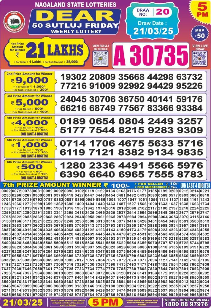 Dear 50 sutluj friday weekly lottery 5 pm result 21-3-25