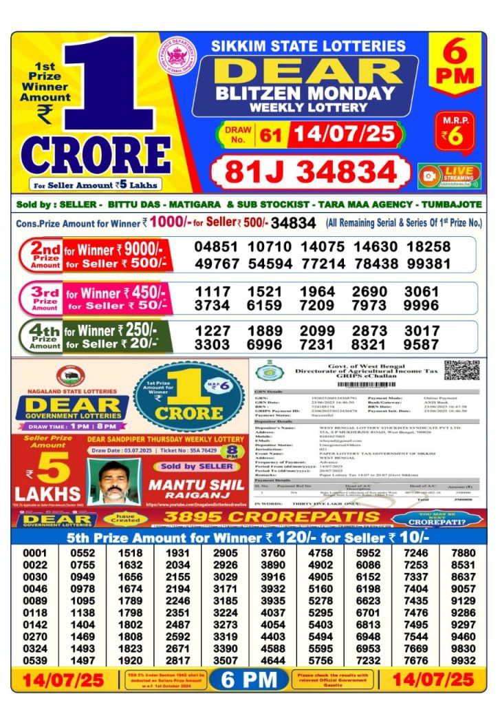 Dear blitzen monday weekly lottery 6 pm result 14-7-25 Results Editorial Staff July 14, 2025 Leave a Comment on Dear blitzen monday weekly lottery 6 pm result 14-7-25 Posted in Dear Lottery 6 PM Result Share: XFacebookPinterestRedditVKDiggLinkedinMix Dear Empire Sunday Weekly Lottery Result Update 📅 Date: 14 July 2025 ⏰ Draw Time: 6:00 PM 🟢 Result Declared 🔗 View previous Dear Lottery 6 PM Result results Related Results Dear Legend Monday Weekly Lottery 6pm Result 02-03-26 Dear Empire Sunday Weekly Lottery 6pm Result 01-03-26 Dear Elite Saturday Weekly Lottery 6pm Result 28-02-26 Dear Crown Friday Weekly Lottery 6pm Result 27-02-26 Dear Supreme Thursday Weekly Lottery 6pm Result 26-02-26 Dear Regal Wednesday Weekly Lottery 6pm Result 25-02-26 Dear Prestige Tuesday Weekly Lottery 6pm Result 24-02-26 Author: Results Editorial Staff