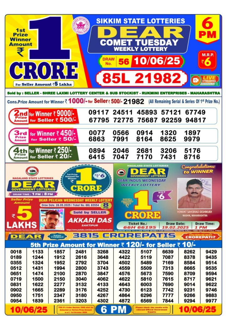 Dear comet tuesday weekly lottery 6 pm result 10-6-25 Results Editorial Staff June 10, 2025 Leave a Comment on Dear comet tuesday weekly lottery 6 pm result 10-6-25 Posted in Dear Lottery 6 PM Result Share: XFacebookPinterestRedditVKDiggLinkedinMix Dear Legend Monday Weekly Lottery Result Update 📅 Date: 10 June 2025 ⏰ Draw Time: 6:00 PM 🟢 Result Declared 🔗 View previous Dear Lottery 6 PM Result results Related Results Dear Legend Monday Weekly Lottery 6pm Result 02-03-26 Dear Empire Sunday Weekly Lottery 6pm Result 01-03-26 Dear Elite Saturday Weekly Lottery 6pm Result 28-02-26 Dear Crown Friday Weekly Lottery 6pm Result 27-02-26 Dear Supreme Thursday Weekly Lottery 6pm Result 26-02-26 Dear Regal Wednesday Weekly Lottery 6pm Result 25-02-26 Dear Prestige Tuesday Weekly Lottery 6pm Result 24-02-26 Author: Results Editorial Staff