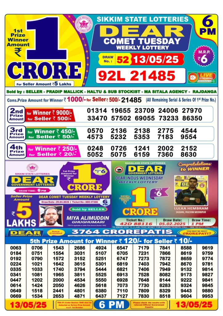 Dear comet tuesday weekly lottery 6 pm result 13-5-25 Results Editorial Staff May 13, 2025 Leave a Comment on Dear comet tuesday weekly lottery 6 pm result 13-5-25 Posted in Dear Lottery 6 PM Result Share: XFacebookPinterestRedditVKDiggLinkedinMix Dear Legend Monday Weekly Lottery Result Update 📅 Date: 13 May 2025 ⏰ Draw Time: 6:00 PM 🟢 Result Declared 🔗 View previous Dear Lottery 6 PM Result results Related Results Dear Legend Monday Weekly Lottery 6pm Result 02-03-26 Dear Empire Sunday Weekly Lottery 6pm Result 01-03-26 Dear Elite Saturday Weekly Lottery 6pm Result 28-02-26 Dear Crown Friday Weekly Lottery 6pm Result 27-02-26 Dear Supreme Thursday Weekly Lottery 6pm Result 26-02-26 Dear Regal Wednesday Weekly Lottery 6pm Result 25-02-26 Dear Prestige Tuesday Weekly Lottery 6pm Result 24-02-26 Author: Results Editorial Staff