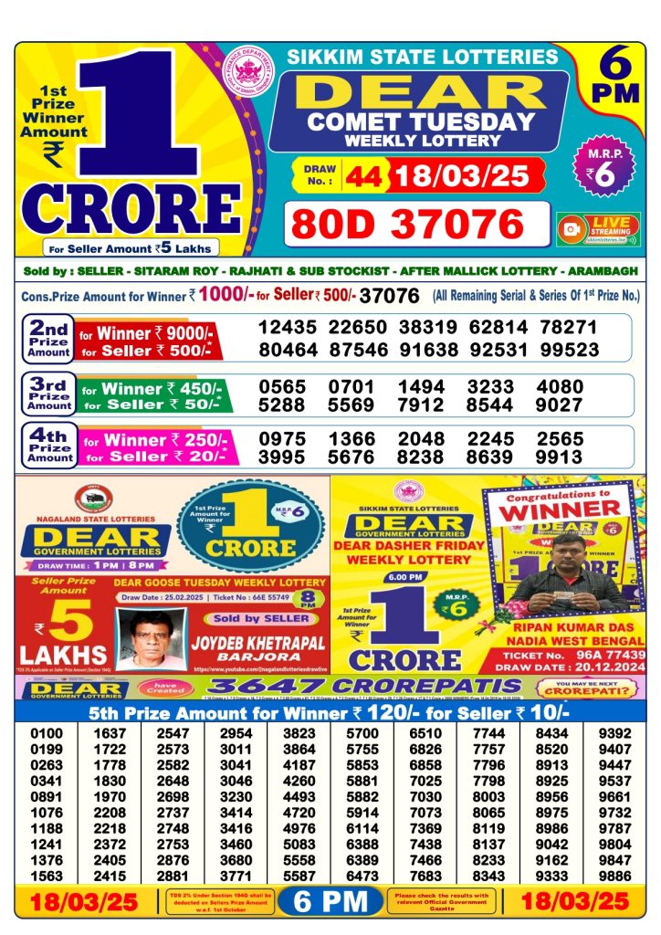 Dear comet tuesday weekly lottery 6 pm result 18-3-25 site editor March 18, 2025 Leave a Comment on Dear comet tuesday weekly lottery 6 pm result 18-3-25 Posted in Dear Lottery 6 PM Result Share: XFacebookPinterestRedditVKDiggLinkedinMix Dear Legend Monday Weekly Lottery Result Update 📅 Date: 18 March 2025 ⏰ Draw Time: 6:00 PM 🟢 Result Declared 🔗 View previous Dear Lottery 6 PM Result results Related Results Dear Legend Monday Weekly Lottery 6pm Result 02-03-26 Dear Empire Sunday Weekly Lottery 6pm Result 01-03-26 Dear Elite Saturday Weekly Lottery 6pm Result 28-02-26 Dear Crown Friday Weekly Lottery 6pm Result 27-02-26 Dear Supreme Thursday Weekly Lottery 6pm Result 26-02-26 Dear Regal Wednesday Weekly Lottery 6pm Result 25-02-26 Dear Prestige Tuesday Weekly Lottery 6pm Result 24-02-26 Author: site editor