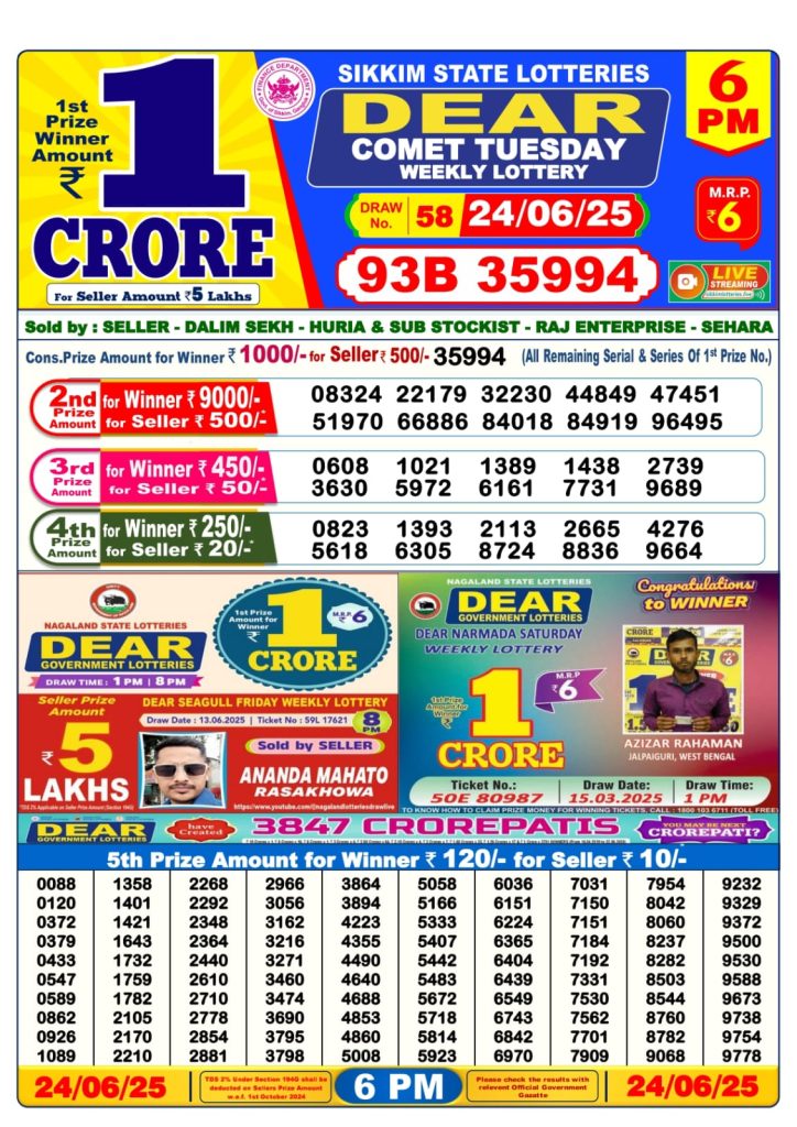 Dear comet tuesday weekly lottery 6 pm result 24-6-25