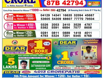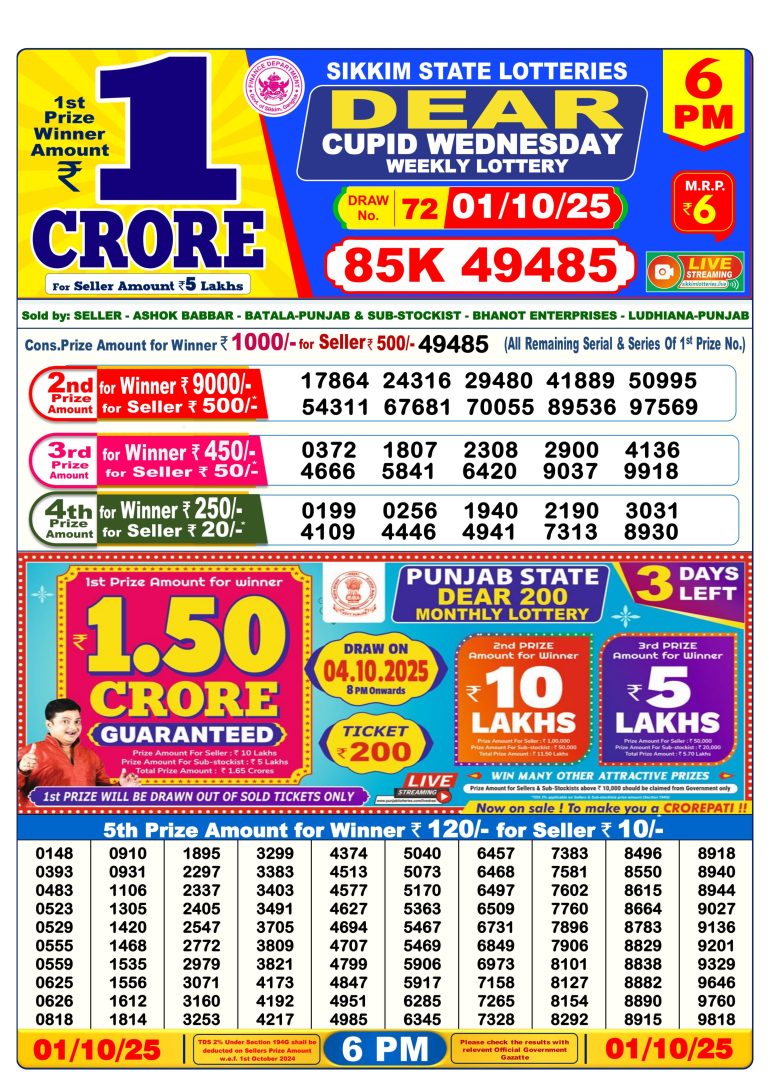 Dear Cupid Wednesday Weekly Lottery 6 PM Result 01-10-25 0 Likes 2 Views Share now: XFacebookPinterestRedditVKDiggLinkedinMix Related Articles 0 2 Dear Comet Tuesday Weekly Lottery 6 PM Result 09-09-25 0 4 Punjab state dear 10 gold monday weekly lottery 26-5-25 0 5 Punjab state dear 10 platinum Thursday weekly lottery 6 pm result 20-2-25 0 5 Dear vixen sunday weekly lottery 6 pm result 15-6-25