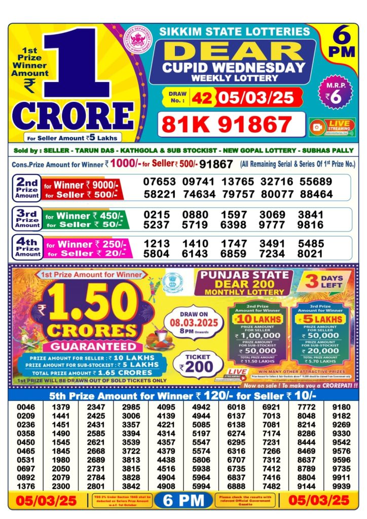 Dear cupid wednesday weekly lottery 6 pm result 5-3-25 site editor March 5, 2025 Leave a Comment on Dear cupid wednesday weekly lottery 6 pm result 5-3-25 Posted in Dear Lottery 6 PM Result Share: XFacebookPinterestRedditVKDiggLinkedinMix Dear Empire Sunday Weekly Lottery Result Update 📅 Date: 05 March 2025 ⏰ Draw Time: 6:00 PM 🟢 Result Declared 🔗 View previous Dear Lottery 6 PM Result results Related Results Dear Legend Monday Weekly Lottery 6pm Result 02-03-26 Dear Empire Sunday Weekly Lottery 6pm Result 01-03-26 Dear Elite Saturday Weekly Lottery 6pm Result 28-02-26 Dear Crown Friday Weekly Lottery 6pm Result 27-02-26 Dear Supreme Thursday Weekly Lottery 6pm Result 26-02-26 Dear Regal Wednesday Weekly Lottery 6pm Result 25-02-26 Dear Prestige Tuesday Weekly Lottery 6pm Result 24-02-26 Author: site editor