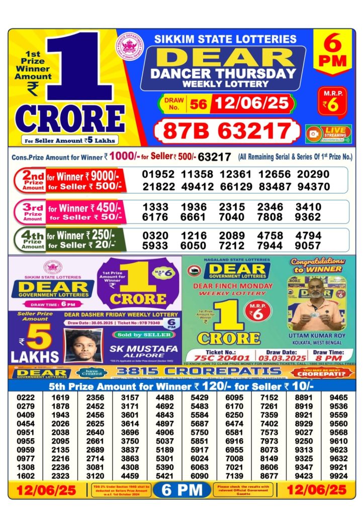 Dear dancer Thursday weekly lottery 6 pm result 12-6-25