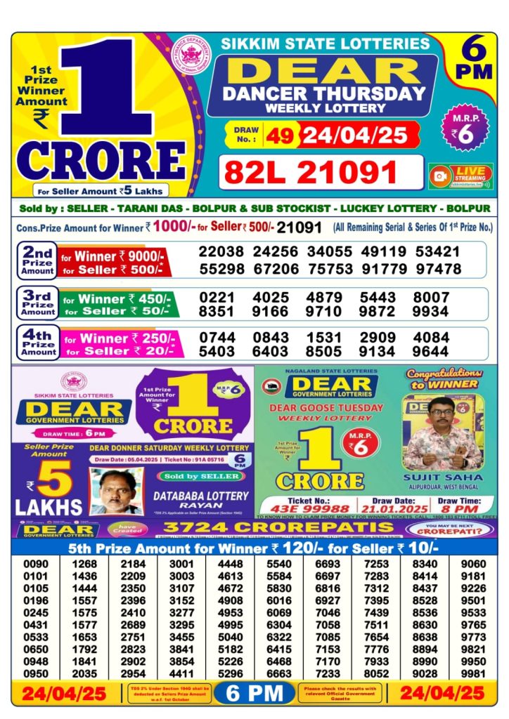 Dear dancer Thursday weekly lottery 6 pm result 24-4-25 Results Editorial Staff April 24, 2025 Leave a Comment on Dear dancer Thursday weekly lottery 6 pm result 24-4-25 Posted in Dear Lottery 6 PM Result Share: XFacebookPinterestRedditVKDiggLinkedinMix Dear Legend Monday Weekly Lottery Result Update 📅 Date: 24 April 2025 ⏰ Draw Time: 6:00 PM 🟢 Result Declared 🔗 View previous Dear Lottery 6 PM Result results Related Results Dear Legend Monday Weekly Lottery 6pm Result 02-03-26 Dear Empire Sunday Weekly Lottery 6pm Result 01-03-26 Dear Elite Saturday Weekly Lottery 6pm Result 28-02-26 Dear Crown Friday Weekly Lottery 6pm Result 27-02-26 Dear Supreme Thursday Weekly Lottery 6pm Result 26-02-26 Dear Regal Wednesday Weekly Lottery 6pm Result 25-02-26 Dear Prestige Tuesday Weekly Lottery 6pm Result 24-02-26 Author: Results Editorial Staff