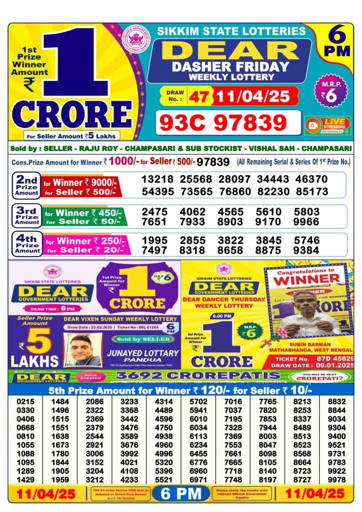 Dear dasher friday weekly lottery 6 pm result 11-4-25 Results Editorial Staff April 11, 2025 Leave a Comment on Dear dasher friday weekly lottery 6 pm result 11-4-25 Posted in Dear Lottery 6 PM Result Share: XFacebookPinterestRedditVKDiggLinkedinMix Dear Legend Monday Weekly Lottery Result Update 📅 Date: 11 April 2025 ⏰ Draw Time: 6:00 PM 🟢 Result Declared 🔗 View previous Dear Lottery 6 PM Result results Related Results Dear Legend Monday Weekly Lottery 6pm Result 02-03-26 Dear Empire Sunday Weekly Lottery 6pm Result 01-03-26 Dear Elite Saturday Weekly Lottery 6pm Result 28-02-26 Dear Crown Friday Weekly Lottery 6pm Result 27-02-26 Dear Supreme Thursday Weekly Lottery 6pm Result 26-02-26 Dear Regal Wednesday Weekly Lottery 6pm Result 25-02-26 Dear Prestige Tuesday Weekly Lottery 6pm Result 24-02-26 Author: Results Editorial Staff