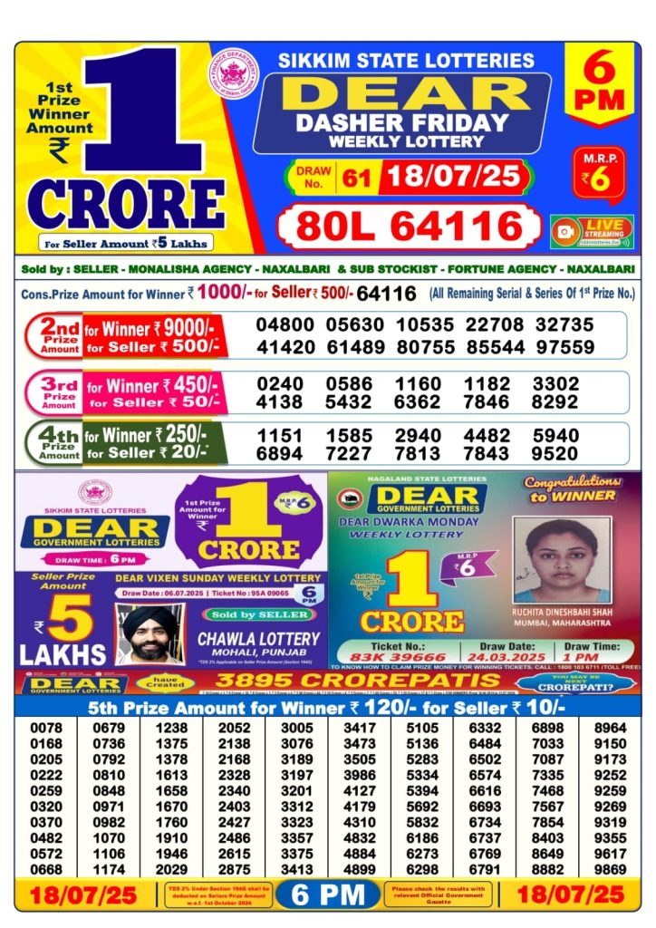 Dear dasher friday weekly lottery 6 pm result 18-7-25 Results Editorial Staff July 18, 2025 Leave a Comment on Dear dasher friday weekly lottery 6 pm result 18-7-25 Posted in Dear Lottery 6 PM Result Share: XFacebookPinterestRedditVKDiggLinkedinMix Dear Legend Monday Weekly Lottery Result Update 📅 Date: 18 July 2025 ⏰ Draw Time: 6:00 PM 🟢 Result Declared 🔗 View previous Dear Lottery 6 PM Result results Related Results Dear Legend Monday Weekly Lottery 6pm Result 02-03-26 Dear Empire Sunday Weekly Lottery 6pm Result 01-03-26 Dear Elite Saturday Weekly Lottery 6pm Result 28-02-26 Dear Crown Friday Weekly Lottery 6pm Result 27-02-26 Dear Supreme Thursday Weekly Lottery 6pm Result 26-02-26 Dear Regal Wednesday Weekly Lottery 6pm Result 25-02-26 Dear Prestige Tuesday Weekly Lottery 6pm Result 24-02-26 Author: Results Editorial Staff
