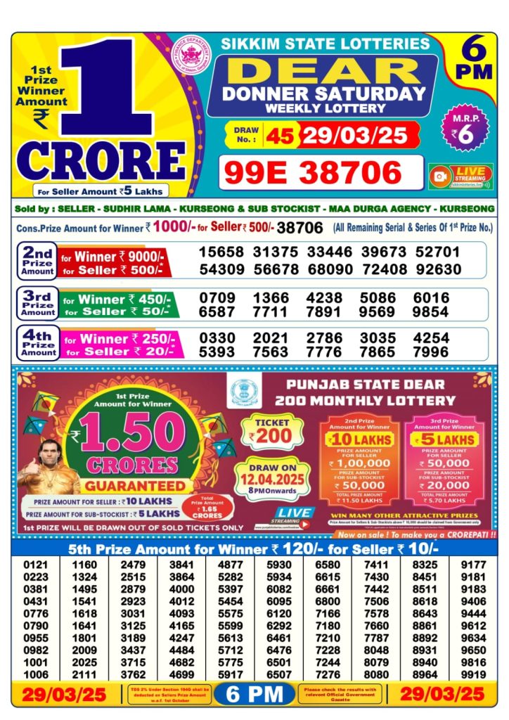 Dear donner Saturday weekly lottery 6 pm result 29-3-25 Results Editorial Staff March 29, 2025 Leave a Comment on Dear donner Saturday weekly lottery 6 pm result 29-3-25 Posted in Dear Lottery 6 PM Result Share: XFacebookPinterestRedditVKDiggLinkedinMix Dear Legend Monday Weekly Lottery Result Update 📅 Date: 29 March 2025 ⏰ Draw Time: 6:00 PM 🟢 Result Declared 🔗 View previous Dear Lottery 6 PM Result results Related Results Dear Legend Monday Weekly Lottery 6pm Result 02-03-26 Dear Empire Sunday Weekly Lottery 6pm Result 01-03-26 Dear Elite Saturday Weekly Lottery 6pm Result 28-02-26 Dear Crown Friday Weekly Lottery 6pm Result 27-02-26 Dear Supreme Thursday Weekly Lottery 6pm Result 26-02-26 Dear Regal Wednesday Weekly Lottery 6pm Result 25-02-26 Dear Prestige Tuesday Weekly Lottery 6pm Result 24-02-26 Author: Results Editorial Staff