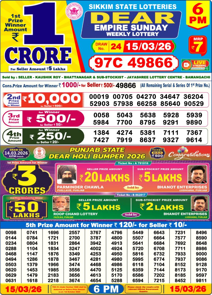Dear Empire Sunday Weekly Lottery 6pm Result 15-03-26