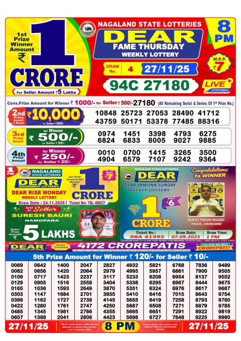 Dear Fame Thursday Weekly Lottery 8pm Result 27-11-25 0 Likes 1 Views Share now: XFacebookPinterestRedditVKDiggLinkedinMix Related Articles 0 4 Dear Sandpiper Thursday Weekly Lottery 8 PM Result 30-10-25 0 3 Dear 2000 Monthly lottery result 09.08.25 8pm winners 0 6 Dear super 500 Monthly Lottery result 24-5-25 0 4 Dear Seagull Friday Weekly Lottery 8 PM Result 08-08-25