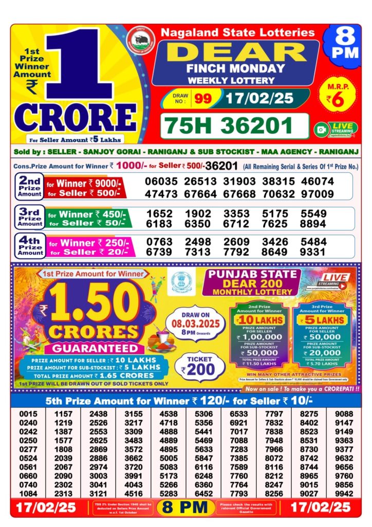 Dear finch monday weekly lottery 8 pm result 17-2-25