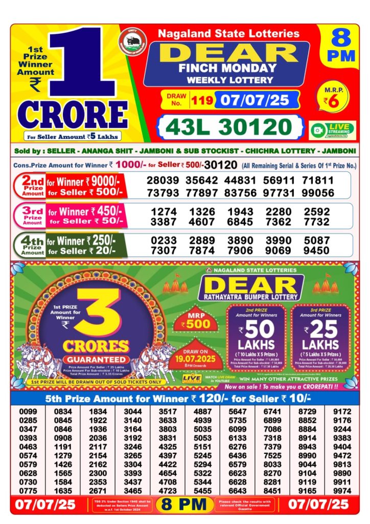 Dear finch monday weekly lottery 8 pm result 7-7-25
