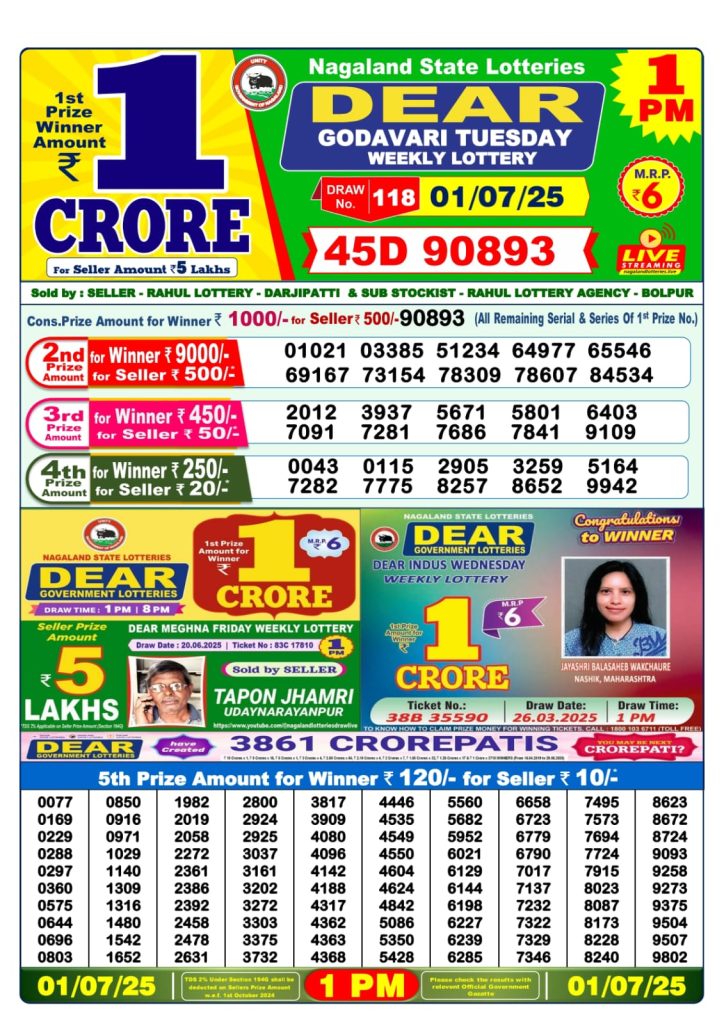 Dear godavari tuesday weekly lottery 1 pm result 1-7-25